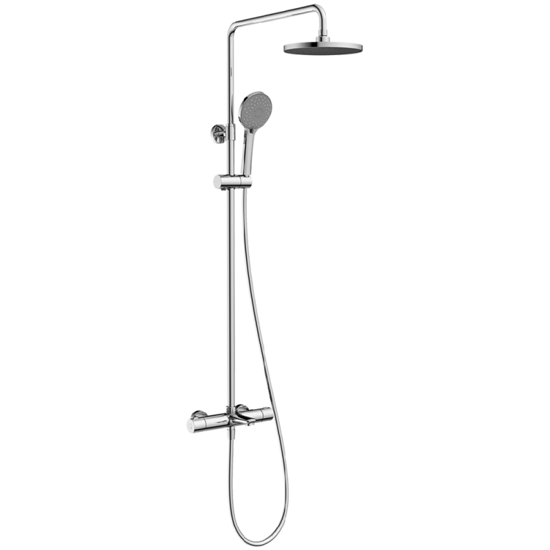 Настенный монтаж. Материалы: душевая труба-нержавеющая сталь, верхний душ-ABS-пластик, ручной душ-ABS-пластик, душевой шланг-ПВХ. Эксцентрик S-образный. Картридж керамический. Тип соединения 1/2''. Душ ручной с 3 режимами струи: релакс, массаж и интенсив. Диаметр верхнего душа-20 см, ручного душа-11 см. Ограничитель температуры, регулируемый. Ручка регулирования температуры с ограничителем безопасности при 38°. Дивертер с 3 режимами: ручной душ, верхний душ, наполнитель для ванны. Расход воды при 3 барах: ручной душ 8.2 л/мин, верхний душ 8 л/мин, наполнитель для ванны 13.8 л/мин.