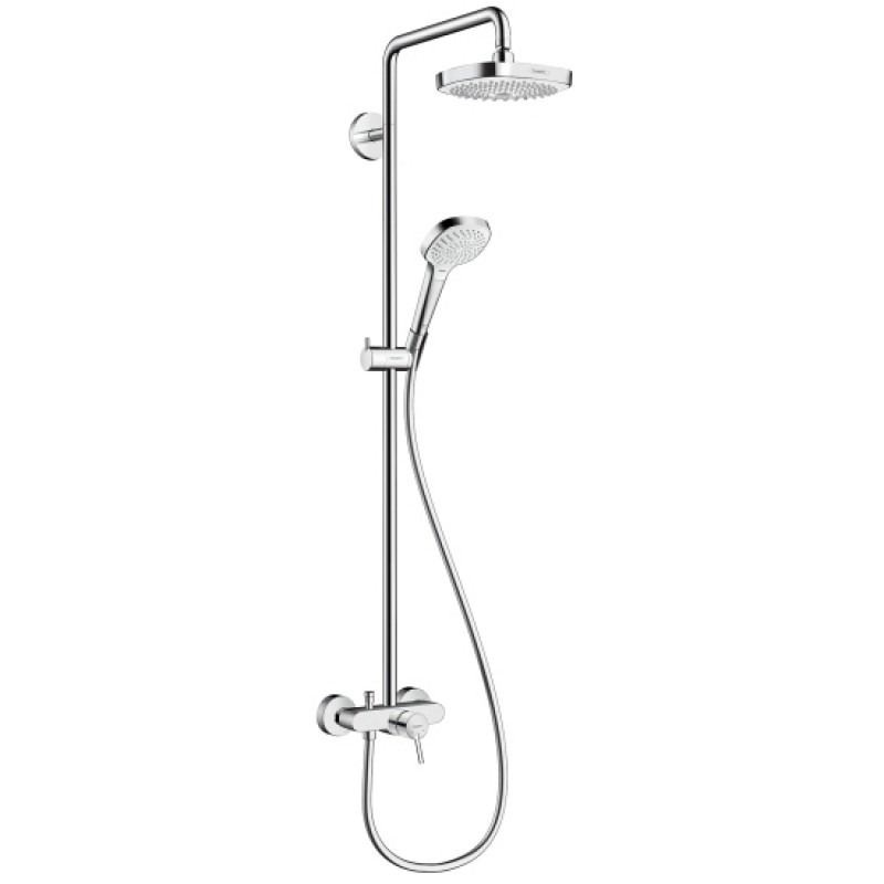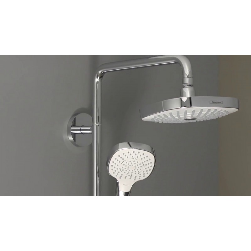 Душевая стойка Hansgrohe Croma Select E 180 Showerpipe 27256400 состоит из: верхнего душа, ручного душа, термостатического смесителя, штанги для душа, держателя для душа.