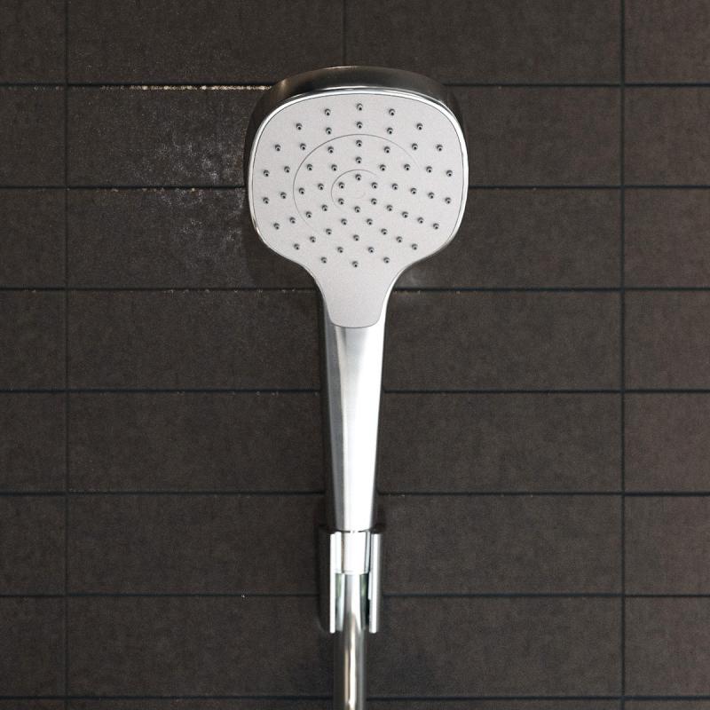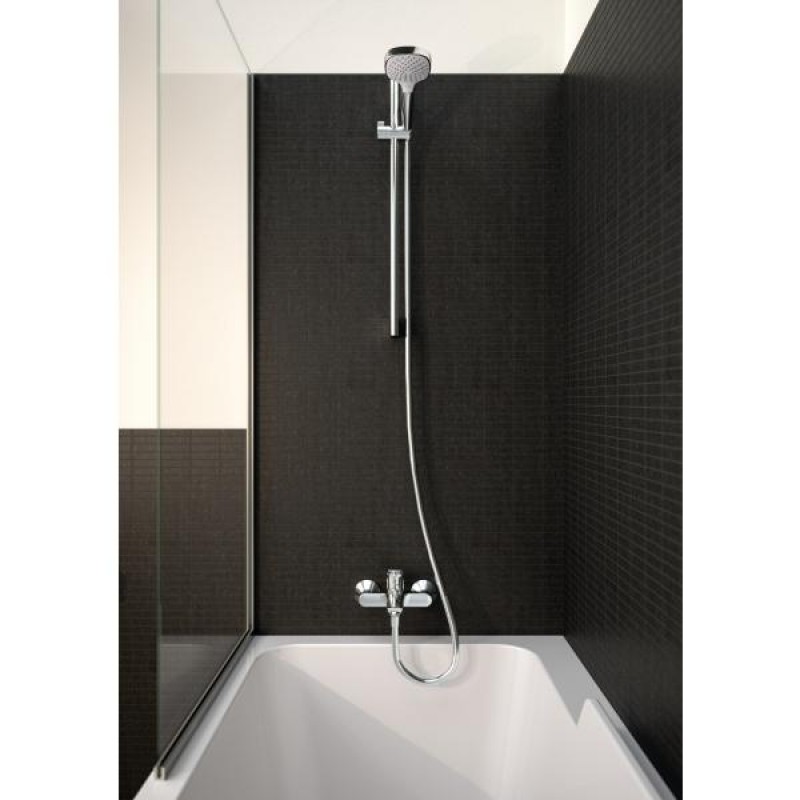 Душевой гарнитур Hansgrohe Croma Select E 1jet 26584400. В комплекте квадратная однорежимная душевая лейка, штанга, держатель для лейки, слайдер и шланг с защитой от изломов. Держатель поворачивается на 45° для выбора наиболее удобного наклона лейки.