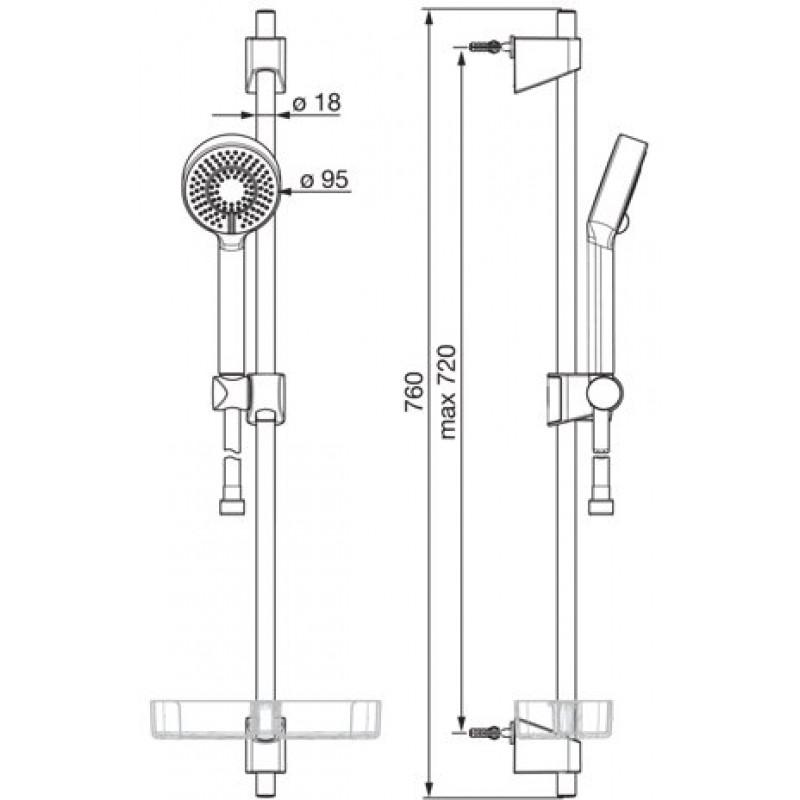- Элементы душа: Ручной душ, Душевая штанга, Регулируемый держатель штанги, Мыльница, Шланг для душа (1750 мм), Функция контроля за расходом воды Eco flow, Защита от известковых отложений. Размер лейки 9.5 см.