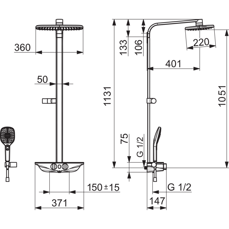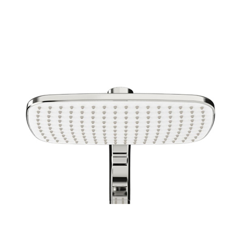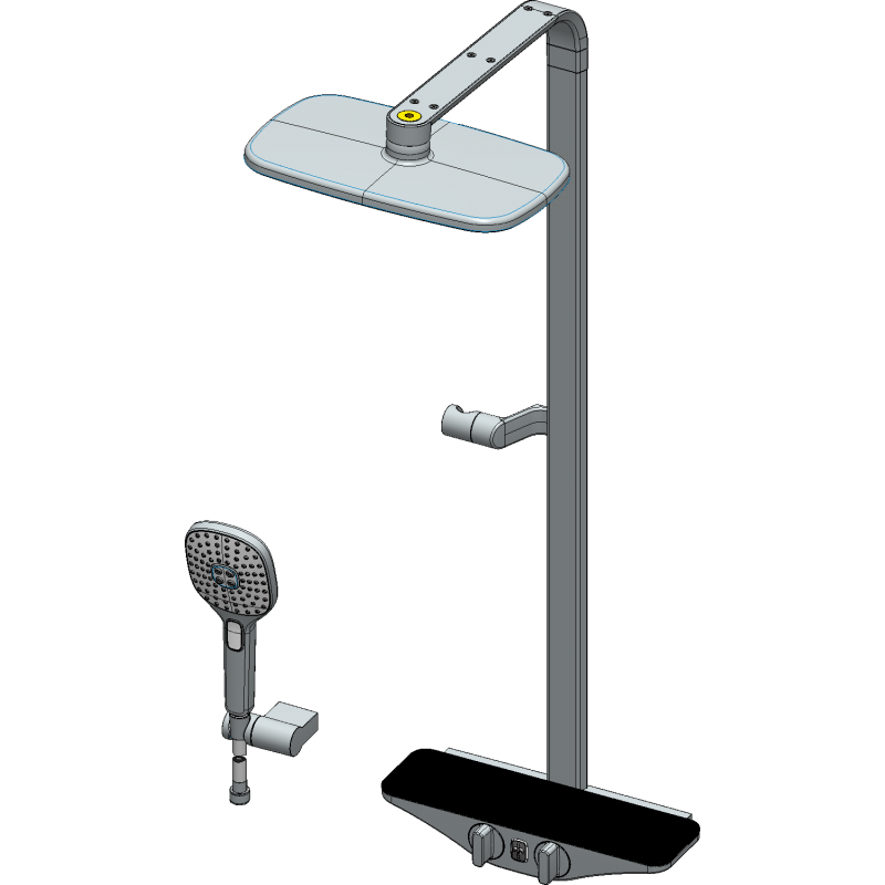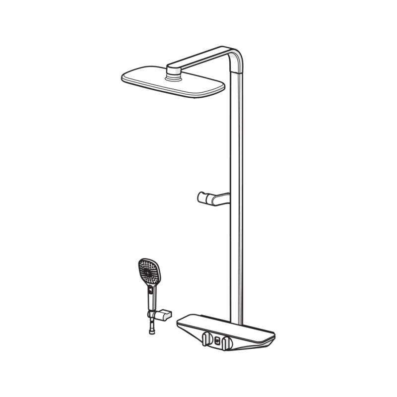 Комплектация: Ручной душ, держатель душевой лейки, шланг для душа 1750 мм, термостатический смеситель, верхний душ, душевая лейка, штанга, полка.