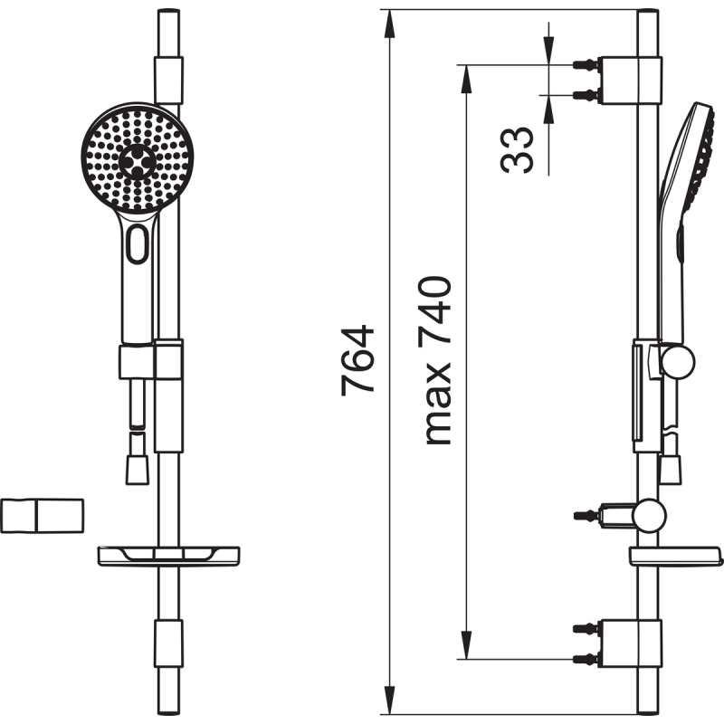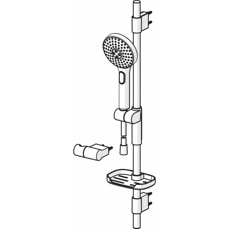 В комплекте: ручной душ 3 режима, душевой шланг 175 см, душевая штанга 74 см регулируемая, держатель для ручного душа, кронштейн настенный, мыльница.