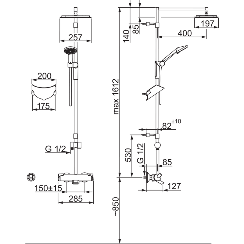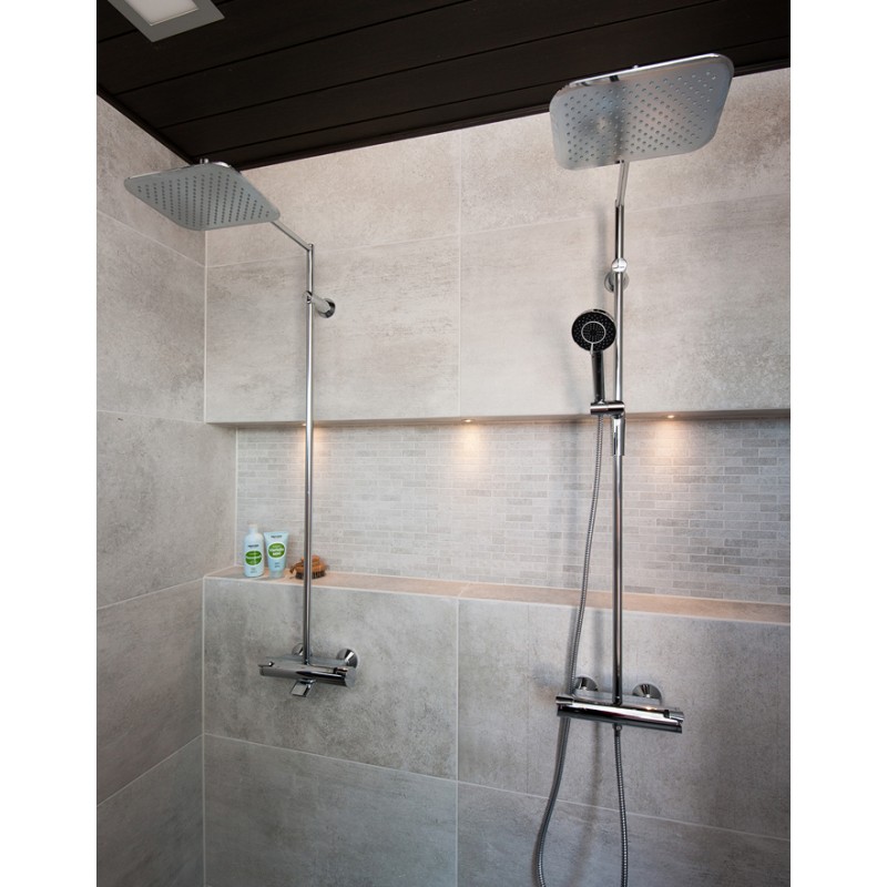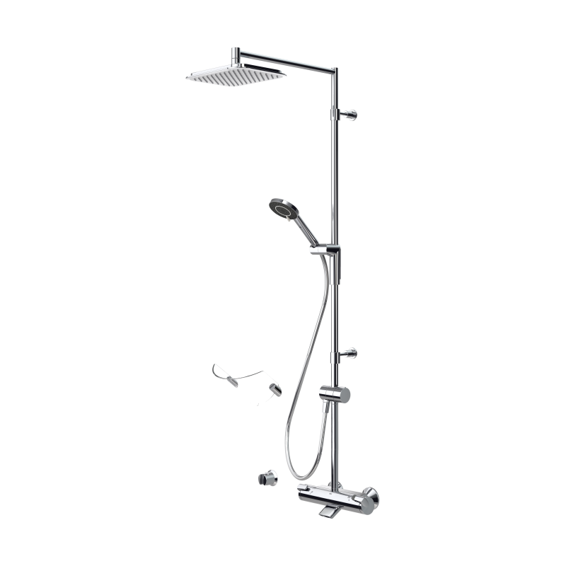 Комплектация: душевая стойка; лейка; шланг; верхний душ; кронштейн для верхнего душа; термостат; мыльница; держатель для душа; душевая штанга; мыльница; аэратор; переключатель потоков.
