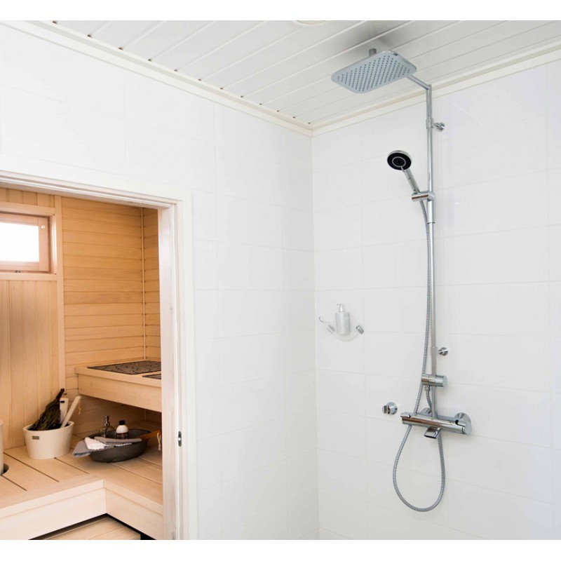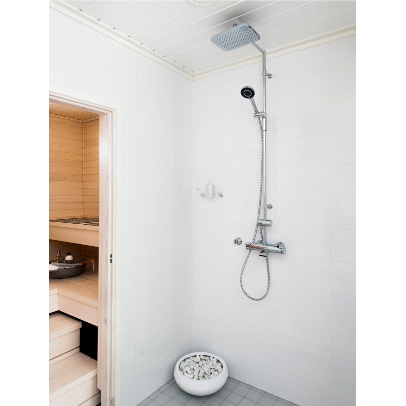 Термостатический смеситель Oras Optima 7193U для душа с душем Rain shower, изливом и ручным душем. Удобные рукоятки, легкий в использовании переключатель режимов и ограничитель температуры воды на рукоятке. Ограничитель расхода воды ECOFLOW. Ручной душ с несколькими режимами и защитой от известковых отложений для исключительного комфорта, держатель для душа и настенный кронштейн.