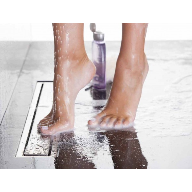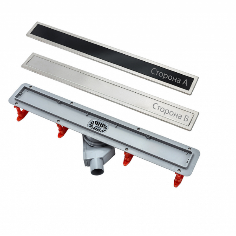 ультра низкий S-образный сифон - 1 шт., редуцир - 1 шт., корпус / держатель решетки - 1 шт., двухсторонняя решетка - 1 шт., рамка - 1 шт., ножки для регулировки высоты монтажа - 2 шт., сетка для улавливания волос и мелкого мусора - 1 шт., устройство для снятия решетки - 1 шт., гидроизоляция MAPEI - 1 комп., крепления - 1 комп.