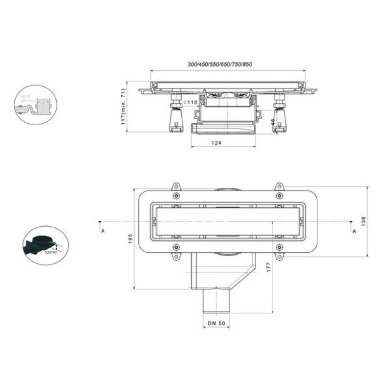Комплектация: ультра низкий S-образный сифон - 1 шт., редуцир - 1 шт., корпус / держатель решетки - 1 шт., двухсторонняя решетка - 1 шт., рамка - 1 шт., ножки для регулировки высоты монтажа - 2 шт., сетка для улавливания волос и мелкого мусора - 1 шт., устройство для снятия решетки - 1 шт., гидроизоляция MAPEI - 1 комп., крепления - 1 комп.