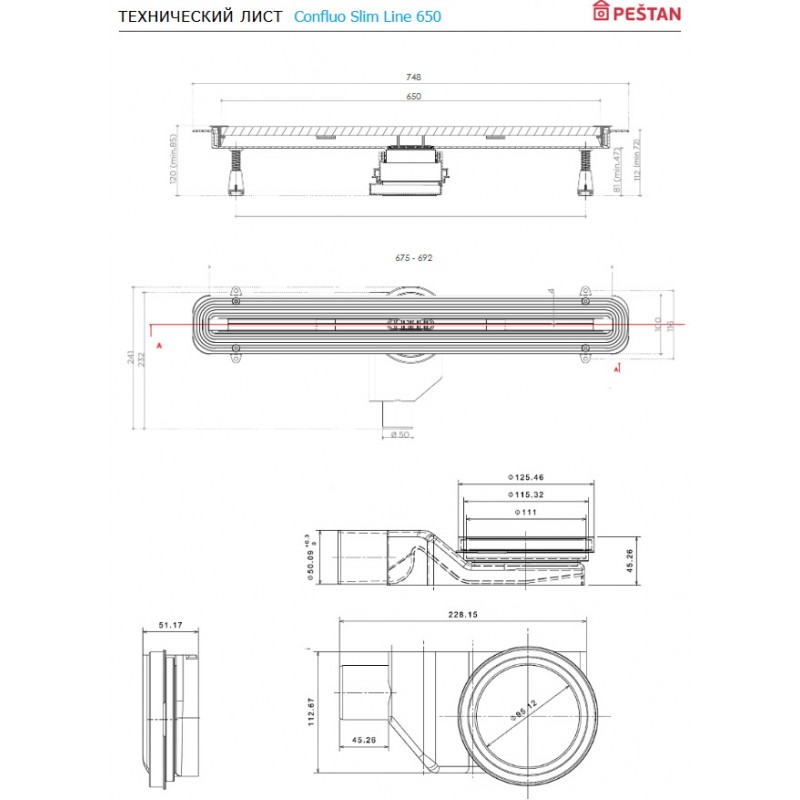 Душевой лоток Pestan Slim Line 650 с деталями из полипропилена, который устойчив к механическим, химическим и термическим повреждениям. Благодаря S-форме сифона, мокрый гидрозатвор надежно защищает от проникновения запаха из канализации. Высота водяного столба 30 мм. (в соответствии с EN 1253). Возможность регулирования высоты монтажа за счет ножек, что позволяют быстро и удобно установить желоб и выровнять его в горизонтальной плоскости. Рамка и решеткой из нержавеющей стали (AISI 304 SS), класс К3 (до 300 кг нагрузки, в соответствии с EN 1253). Конструктивно возможна вкладка в рамку керамическую плитку, мрамор, закаленное стекло.