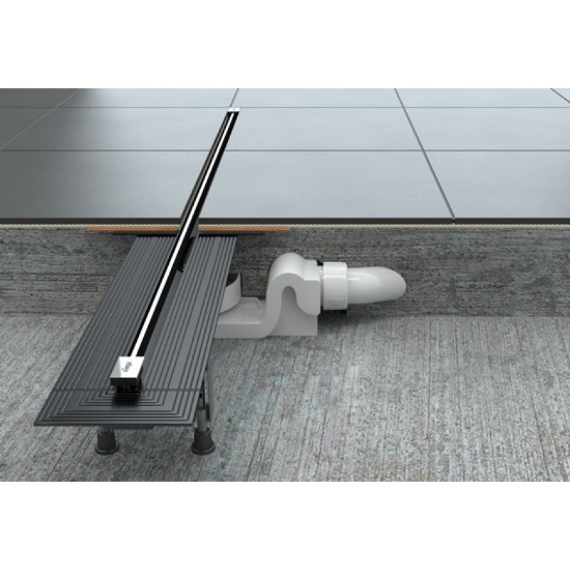 Душевой лоток изготовлен из высококачественного пластика и дополнительно комплектуется дизайн-вставками из нержавеющей стали.