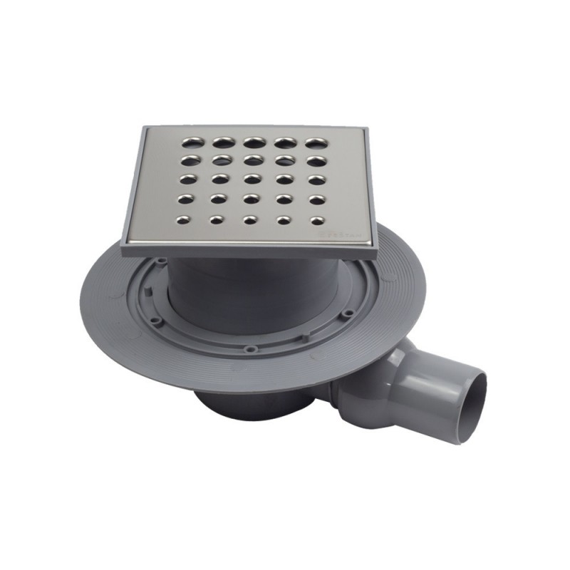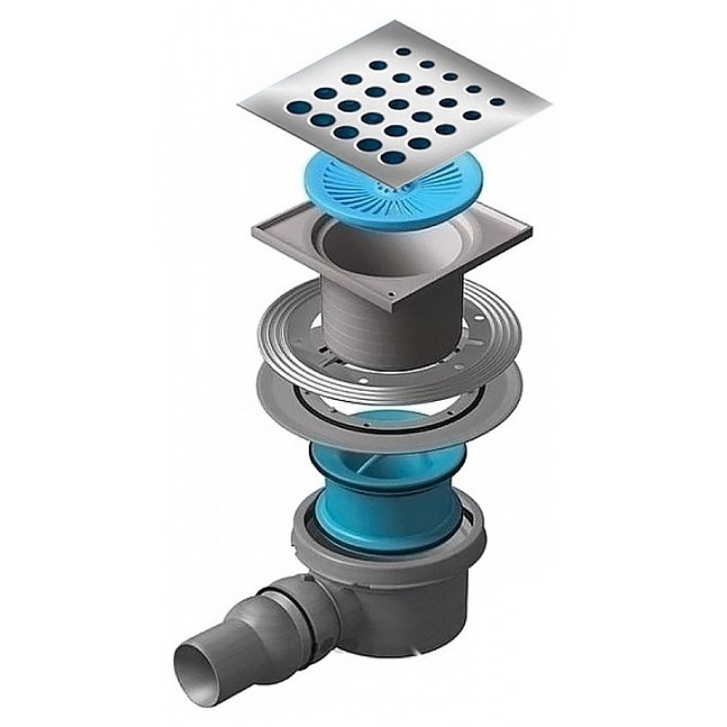 - Наличие в комплектации изолирующего воротника (гидроизоляционного кольца и фланца) делает ненужным использование битумных и пластиковых лент (для герметизации между стяжкой пола и плиткой). Регулируемый угол выхода на 15°.