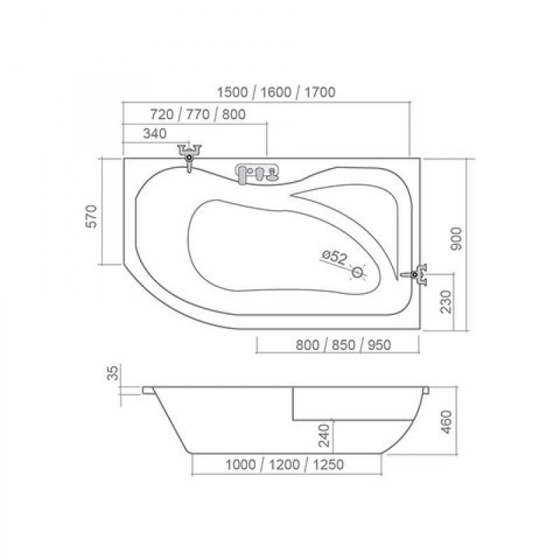 Ванна Activa имеет размеры: 150х90, 160х90 и 170х90 см. Ванна бывает левосторонняя и правосторонняя.