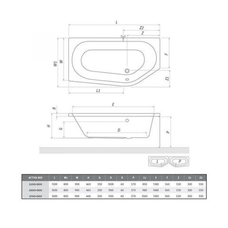 Ванна Activa Neo имеет размеры: 150х90, 160х90 и 170х90 см. Ванна бывает левосторонняя и правосторонняя.