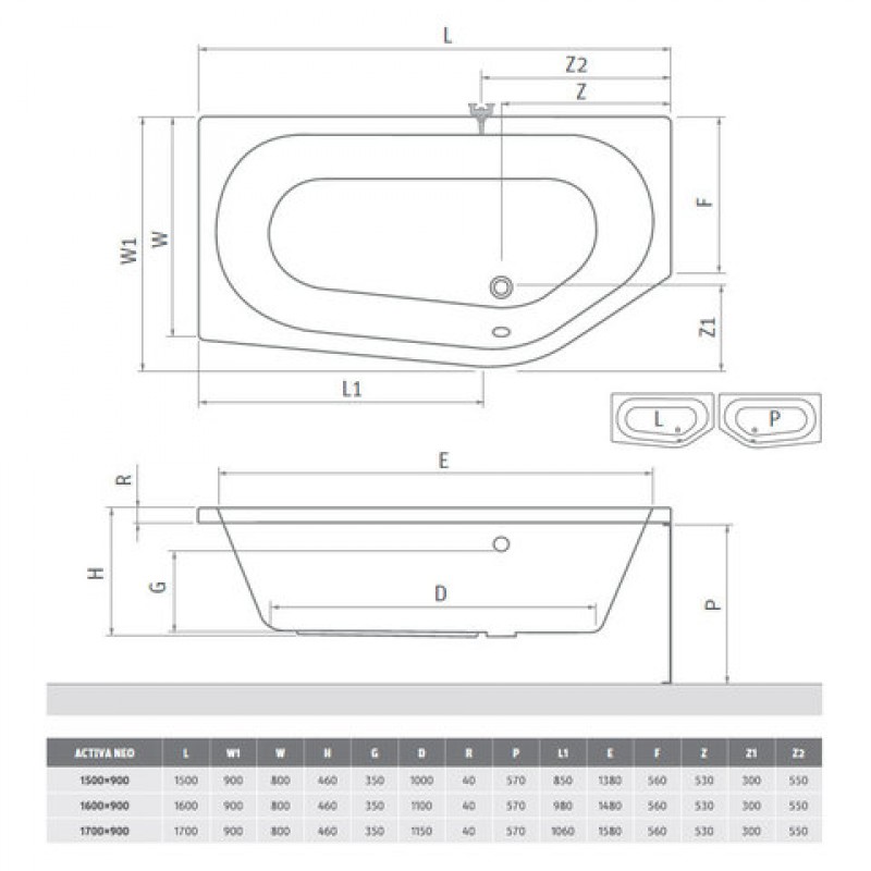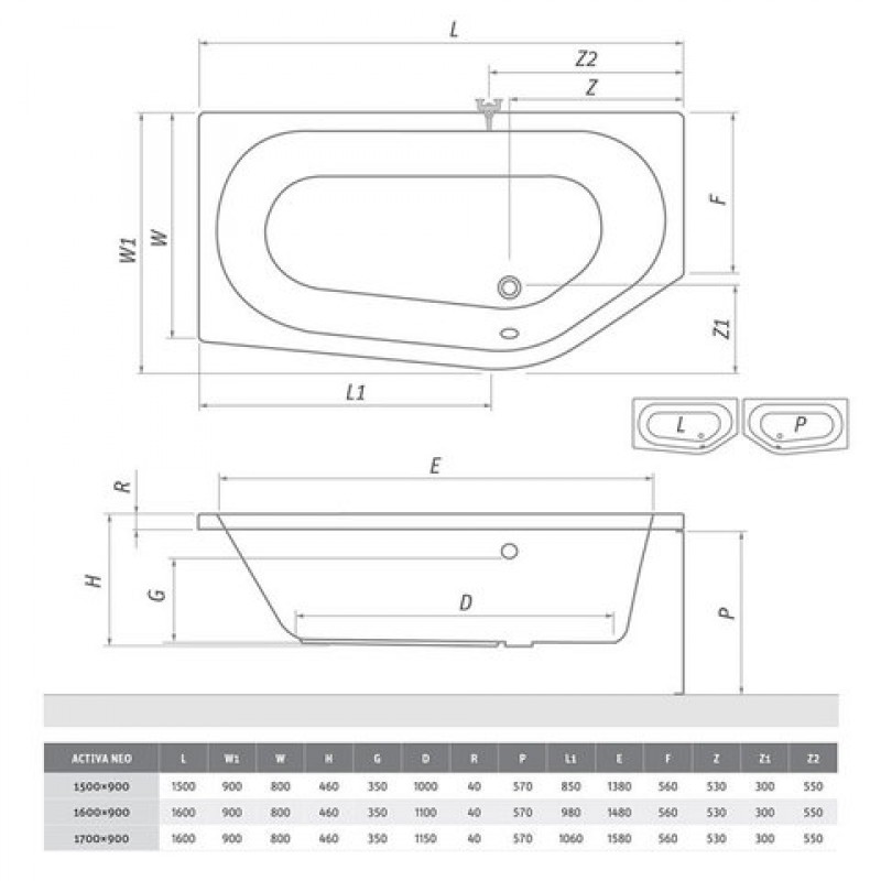 Ванна Activa Neo имеет размеры: 150х90, 160х90 и 170х90 см. Ванна бывает левосторонняя и правосторонняя.