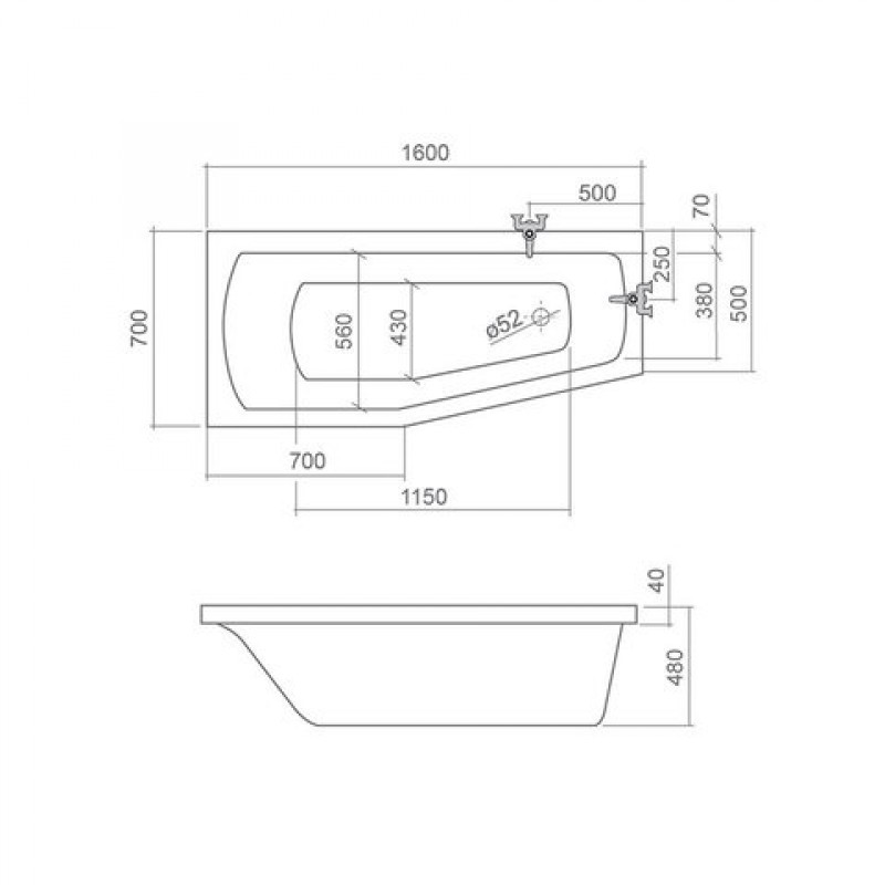 Ванна Mini L/R имеет следующие размеры: 160х70 см. Ассиметричная ванна производится в право- и левостороннем исполнении.