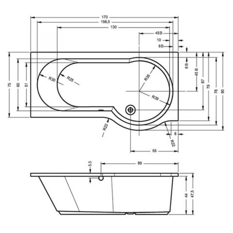 Размеры 170х75 см (в широком месте 90 см). Глубина - 44 см. Объем - 205 литров.