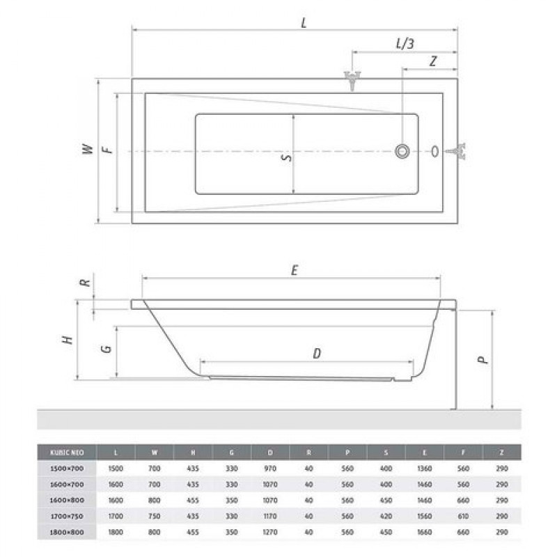 Ванна Kubic Neo имеет размеры 150х70, 160х70, 160х80, 170х75 и 180х80 см.