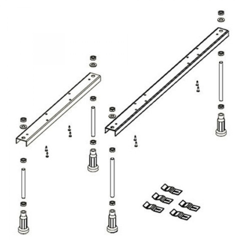 Комплект состоит из двух металлических планок для крепления ко дну ванны, четырёх пластиковых крепежей на стену, четырёх пластиковых регулируемых ножек и комплекта гаек, шайб, саморезов и дюбелей. Отдельно опоры не продаются, только как комплектация ванн RIHO.
