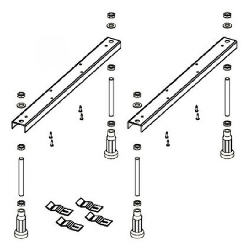 Комплект состоит из двух металлических планок для крепления ко дну ванны, четырёх пластиковых крепежей на стену, четырёх пластиковых регулируемых ножек и комплекта гаек, шайб, саморезов и дюбелей. Отдельно опоры не продаются, только как комплектация ванн RIHO.